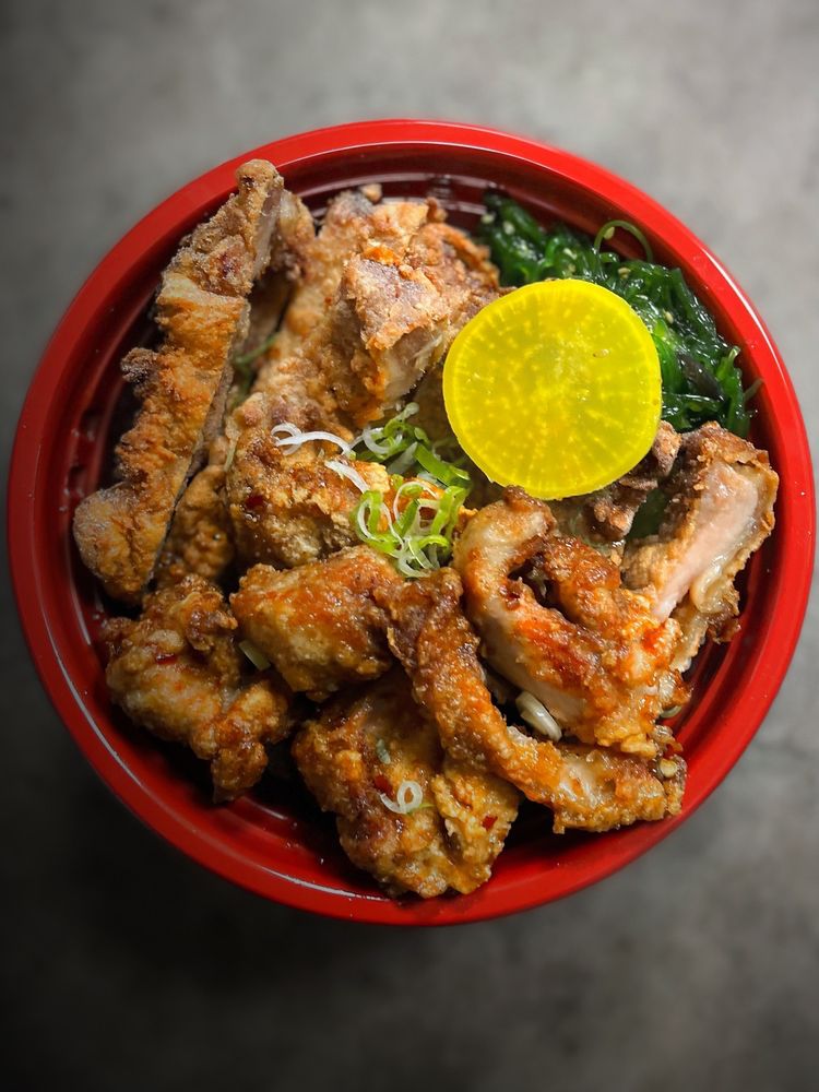 Chewy Japanese noodles in a dashi-based broth topped with chicken, fish paste and vegetables.