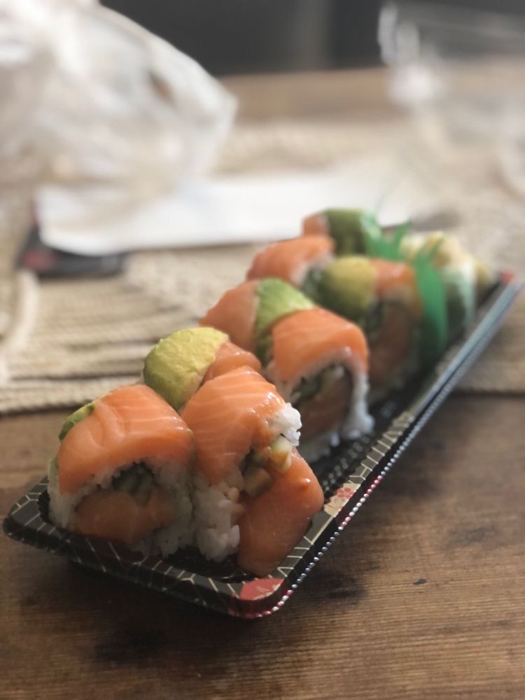 Seasoned sushi rice spread out on nori seaweed sheets, filled with salmon, avocado, crab, then rolled and cut into bite-sized pieces.